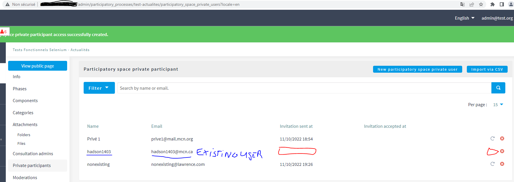 For a Participatory space or Assembly when you try to invite en Existing User to a Participatory space or Assembly as a Private Participants, the invite is not sent. The column Invitation sent at stays empty and the Ressend button is not displayed so we cant send the invitation a 2nd time.